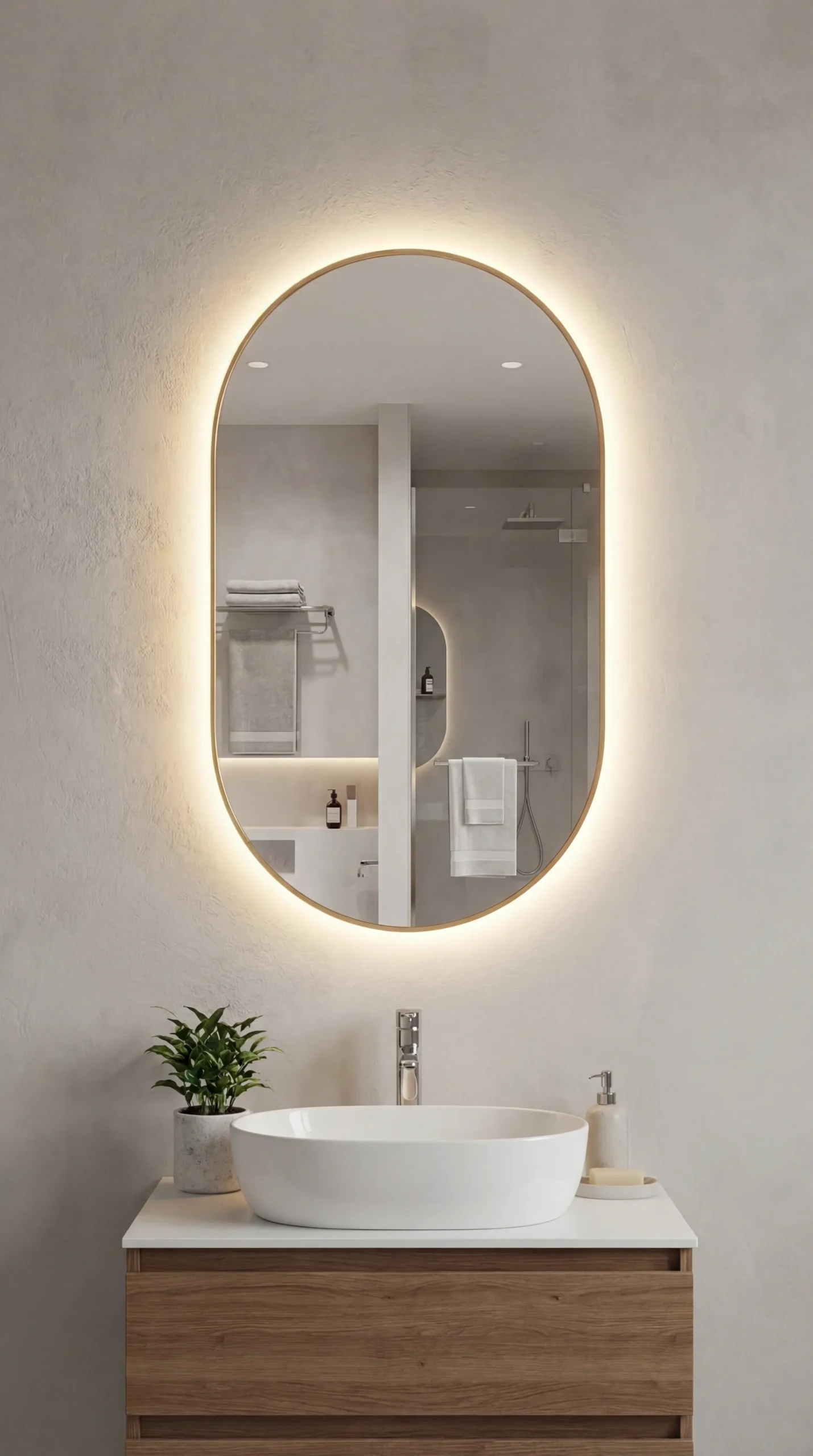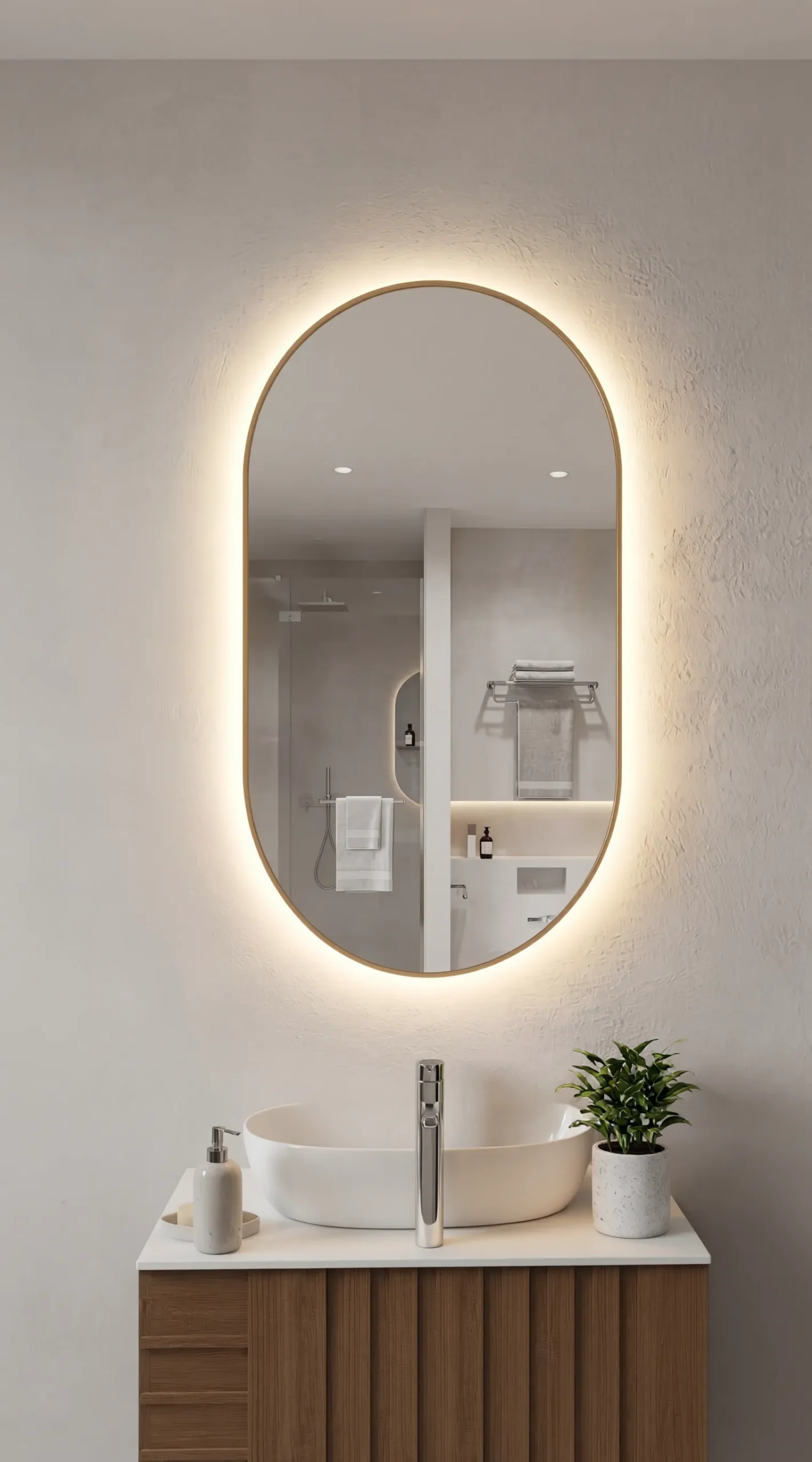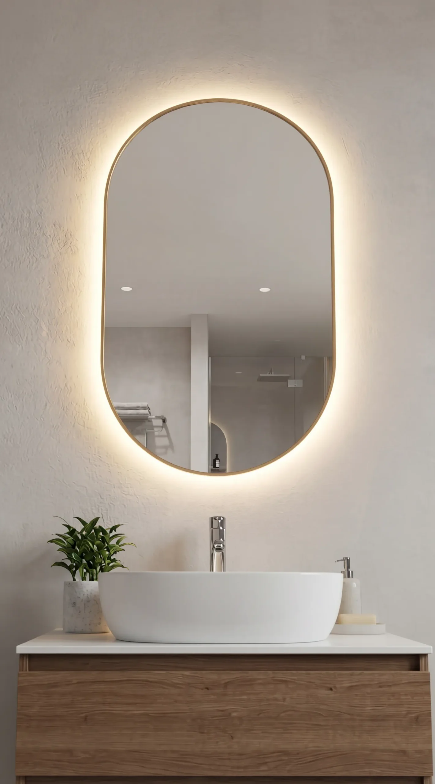 Designed for the modern vanity, the Aura mirror features an elongated oval shape that adds a sense of height and elegance to your walls. Its warm-toned light is specifically calibrated to provide natural, flattering illumination, making it the ideal companion for detailed skincare or makeup application. The frameless-feel glass is treated with an anti-corrosion layer, ensuring it maintains its brilliant clarity even in high-moisture bathroom environments.