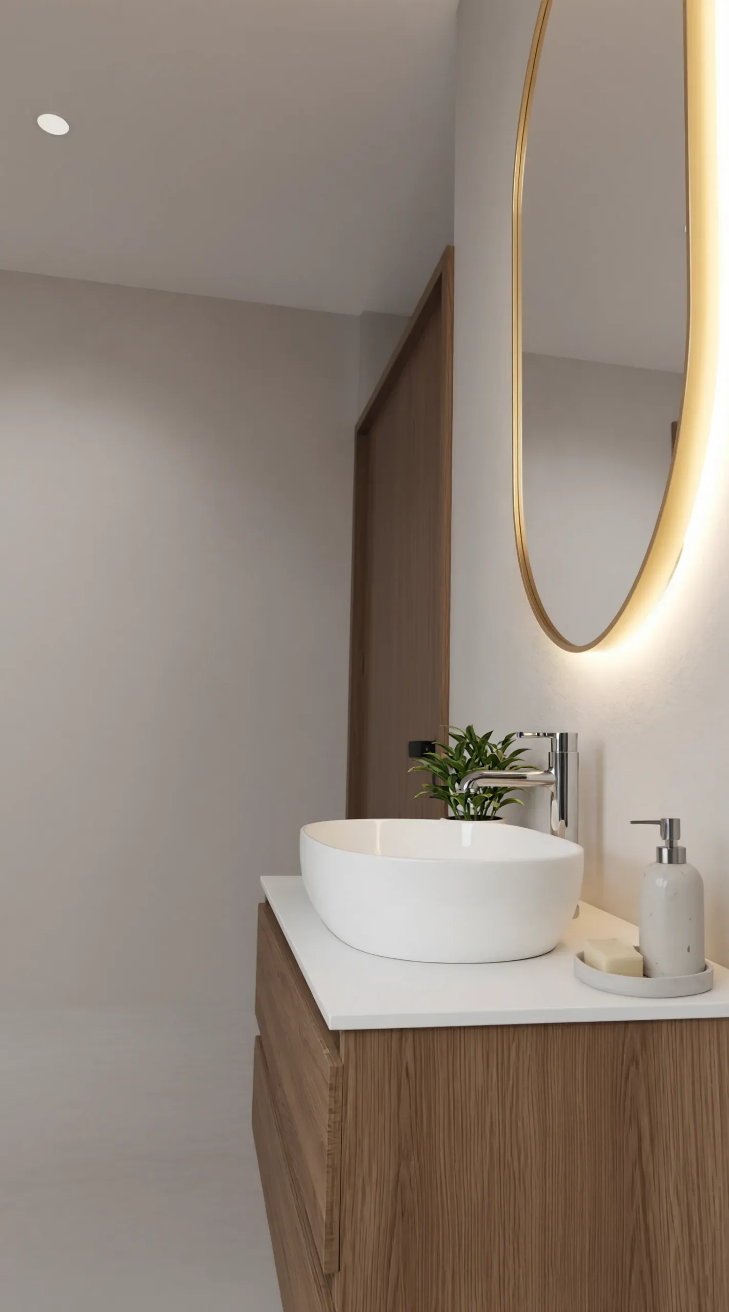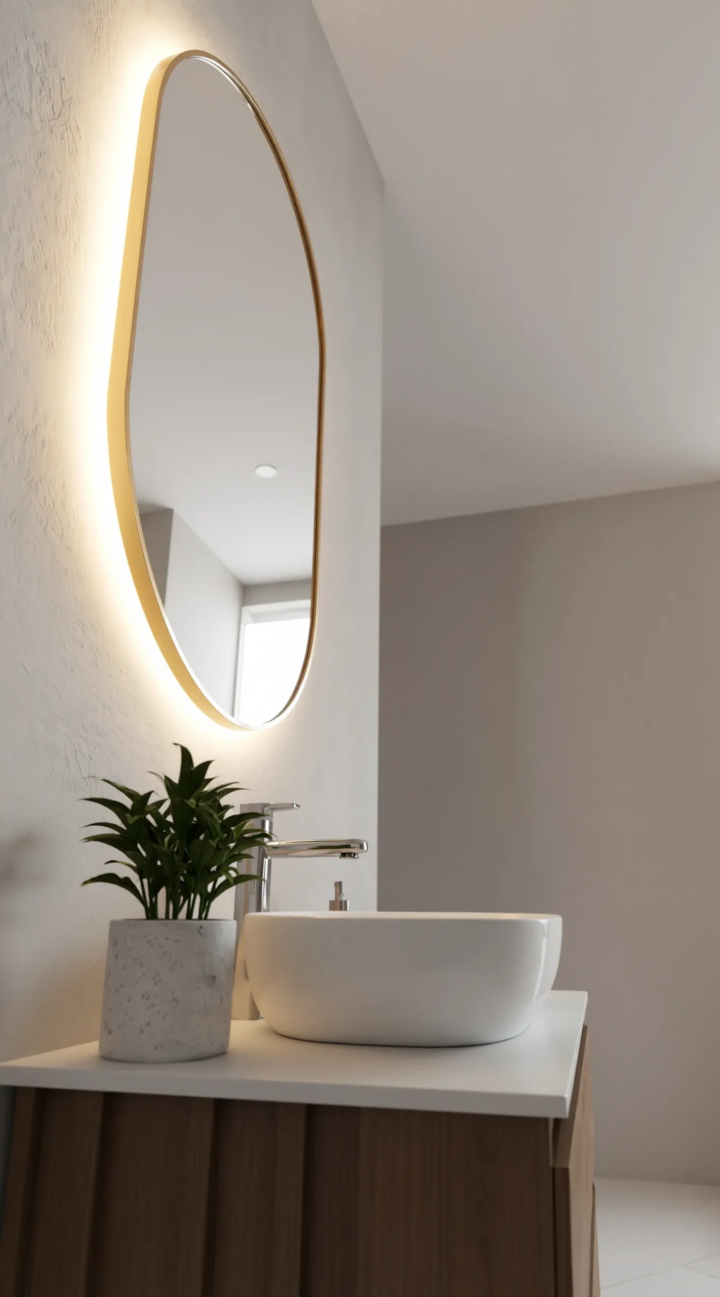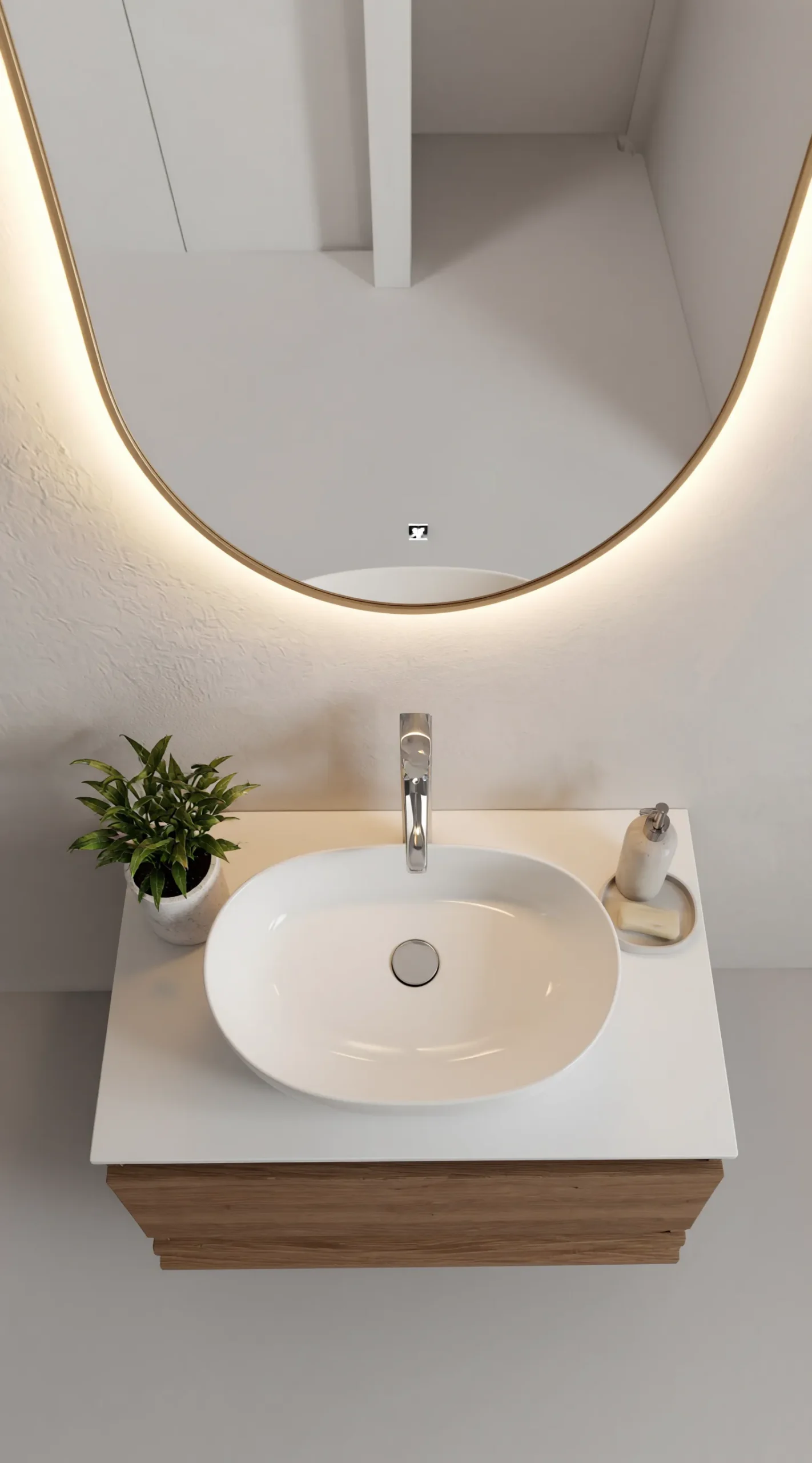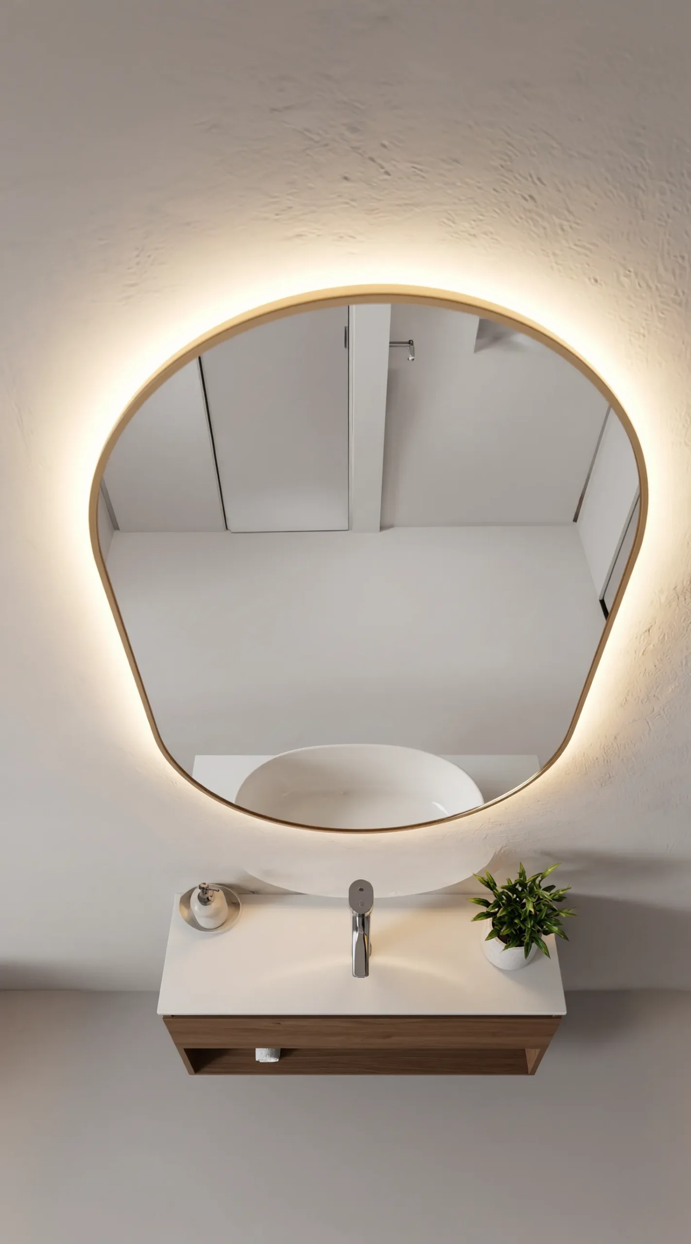 Designed for the modern vanity, the Aura mirror features an elongated oval shape that adds a sense of height and elegance to your walls. Its warm-toned light is specifically calibrated to provide natural, flattering illumination, making it the ideal companion for detailed skincare or makeup application. The frameless-feel glass is treated with an anti-corrosion layer, ensuring it maintains its brilliant clarity even in high-moisture bathroom environments.