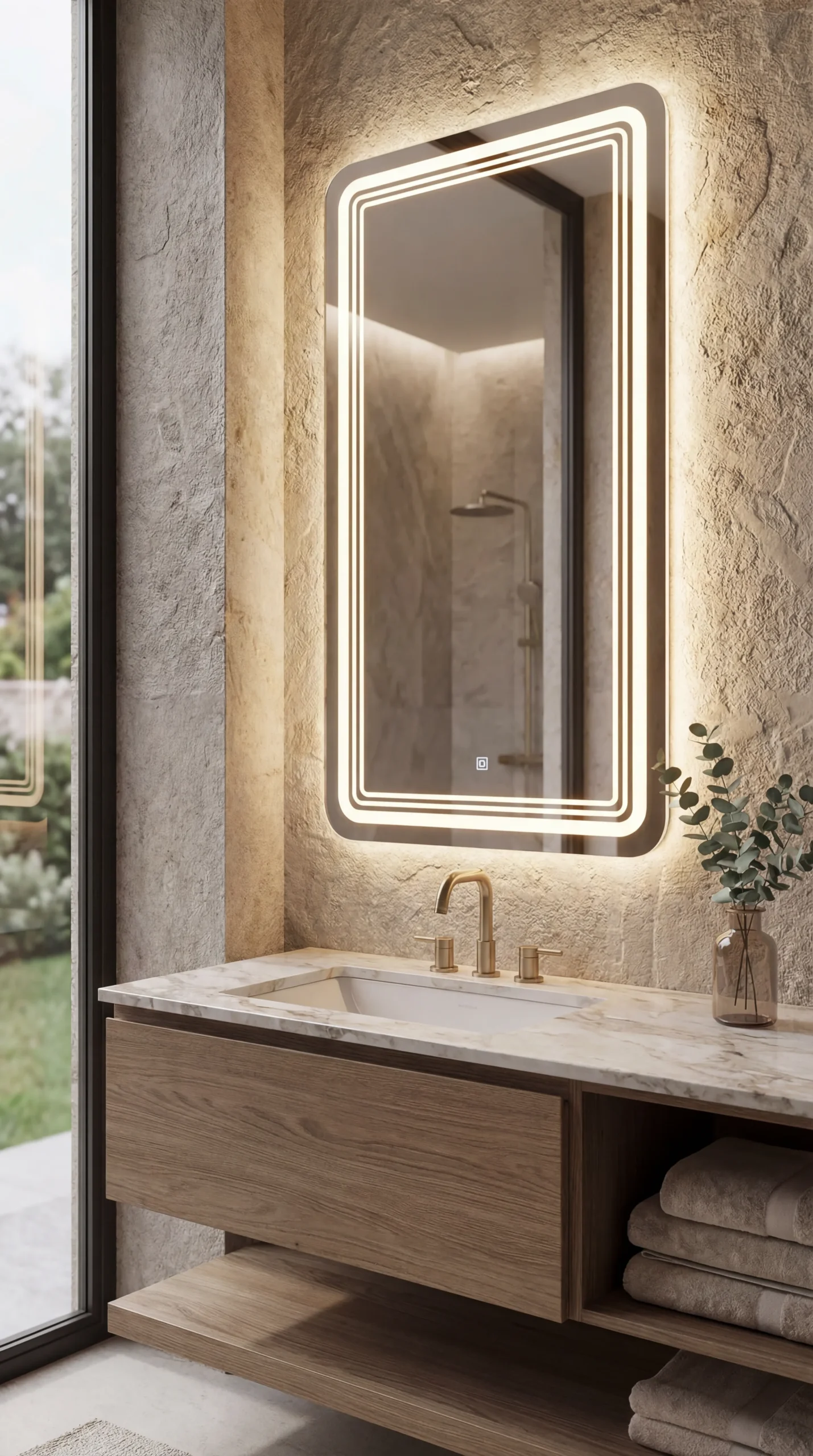 Elevate your daily grooming ritual with the Aurora Triple-Band LED Wall Mirror. This sophisticated piece moves beyond standard lighting by featuring three concentric bands of brilliant LED light, creating a deep, halo-like effect that is both functional and decorative. The sleek, rectangular form with gently rounded corners offers a clean, architectural look that complements high-end stone finishes and modern wood vanities perfectly.