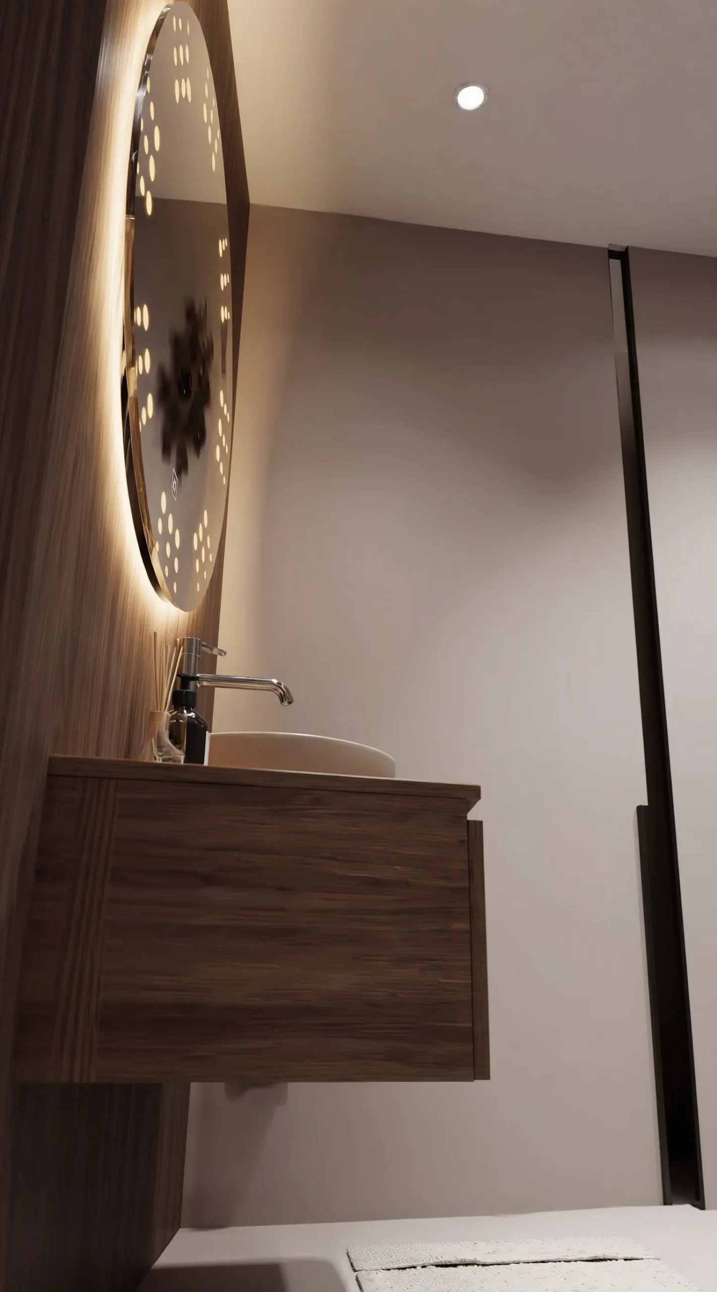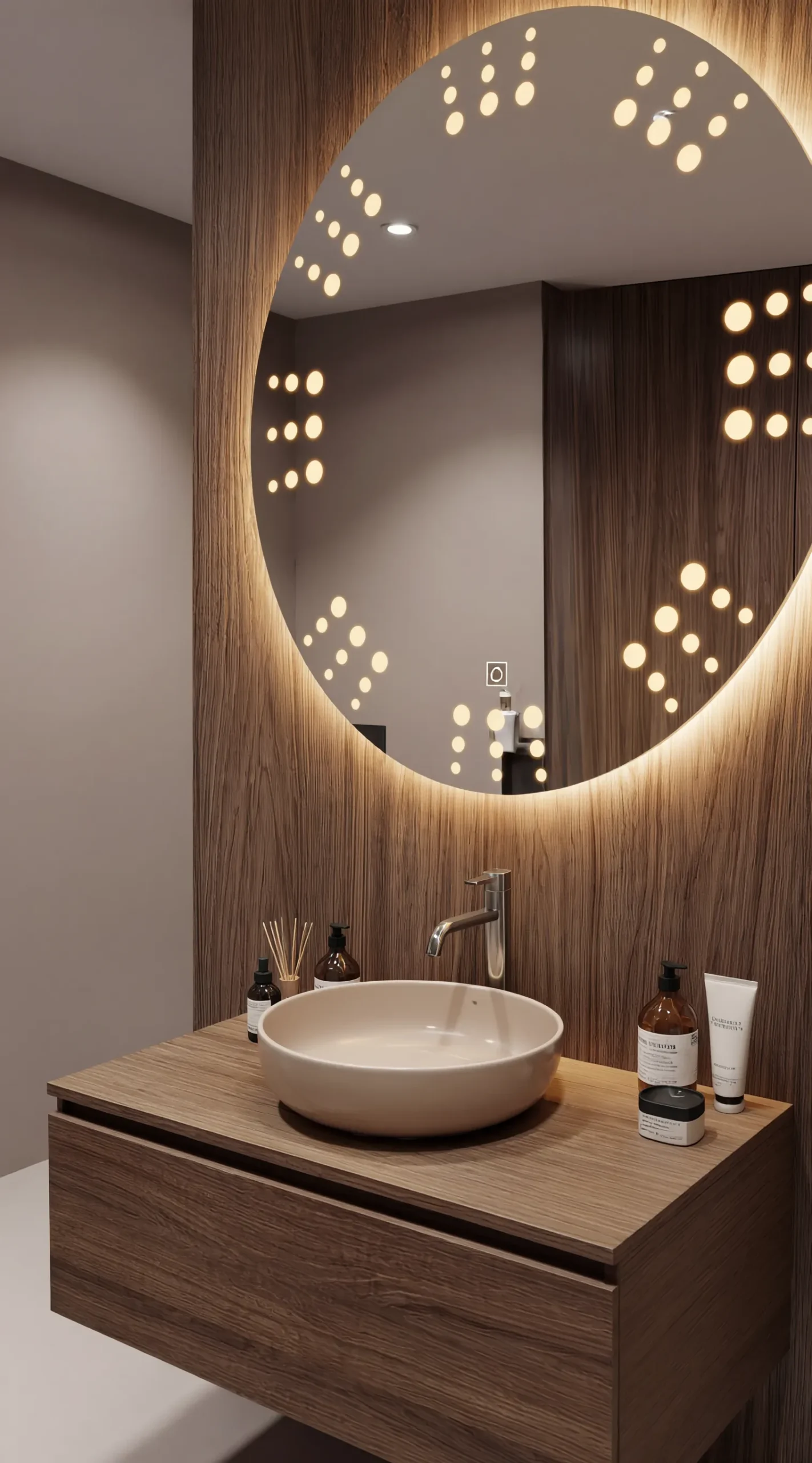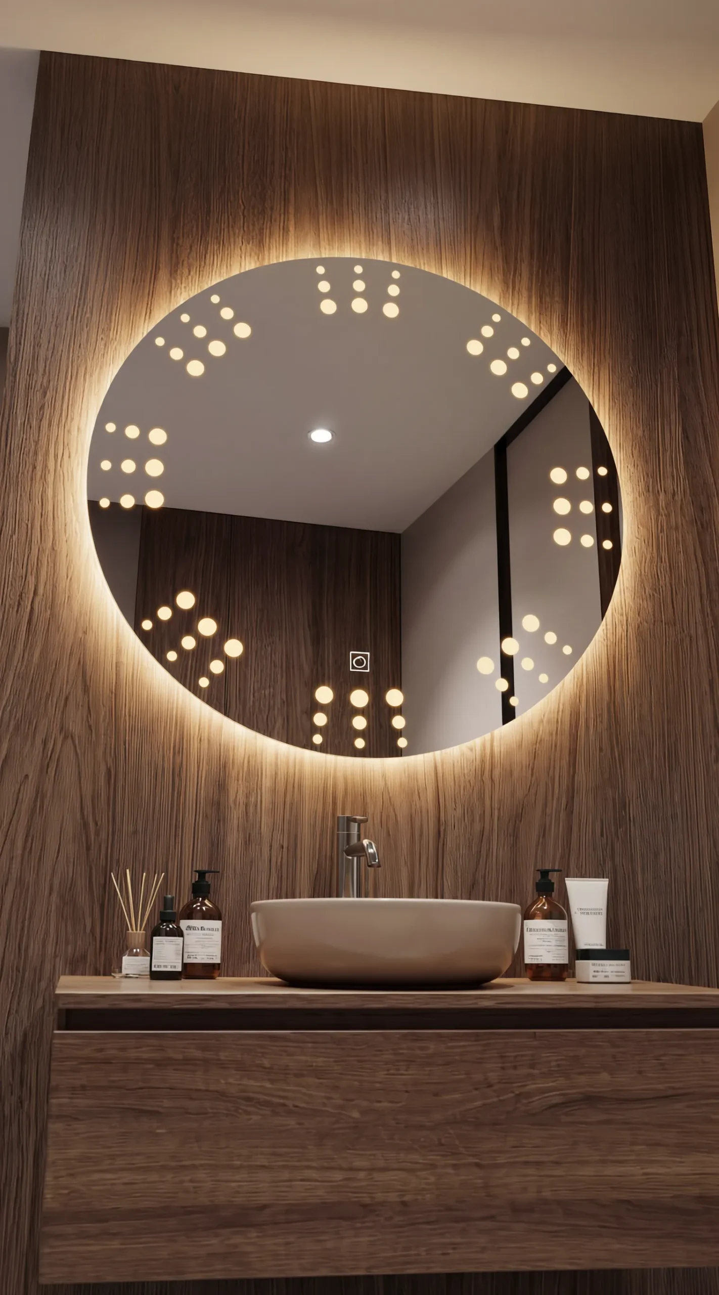 The timeless round shape is enhanced by a powerful backlit halo that washes your wall in a gentle, atmospheric glow. This dual-lighting approach ensures that while your space is filled with ambient light, your face remains evenly illuminated for grooming or skincare. The minimalist, frameless design allows the intricate light pattern to take center stage, making it an ideal choice for wood-paneled feature walls, textured stone, or clean tiled surfaces.