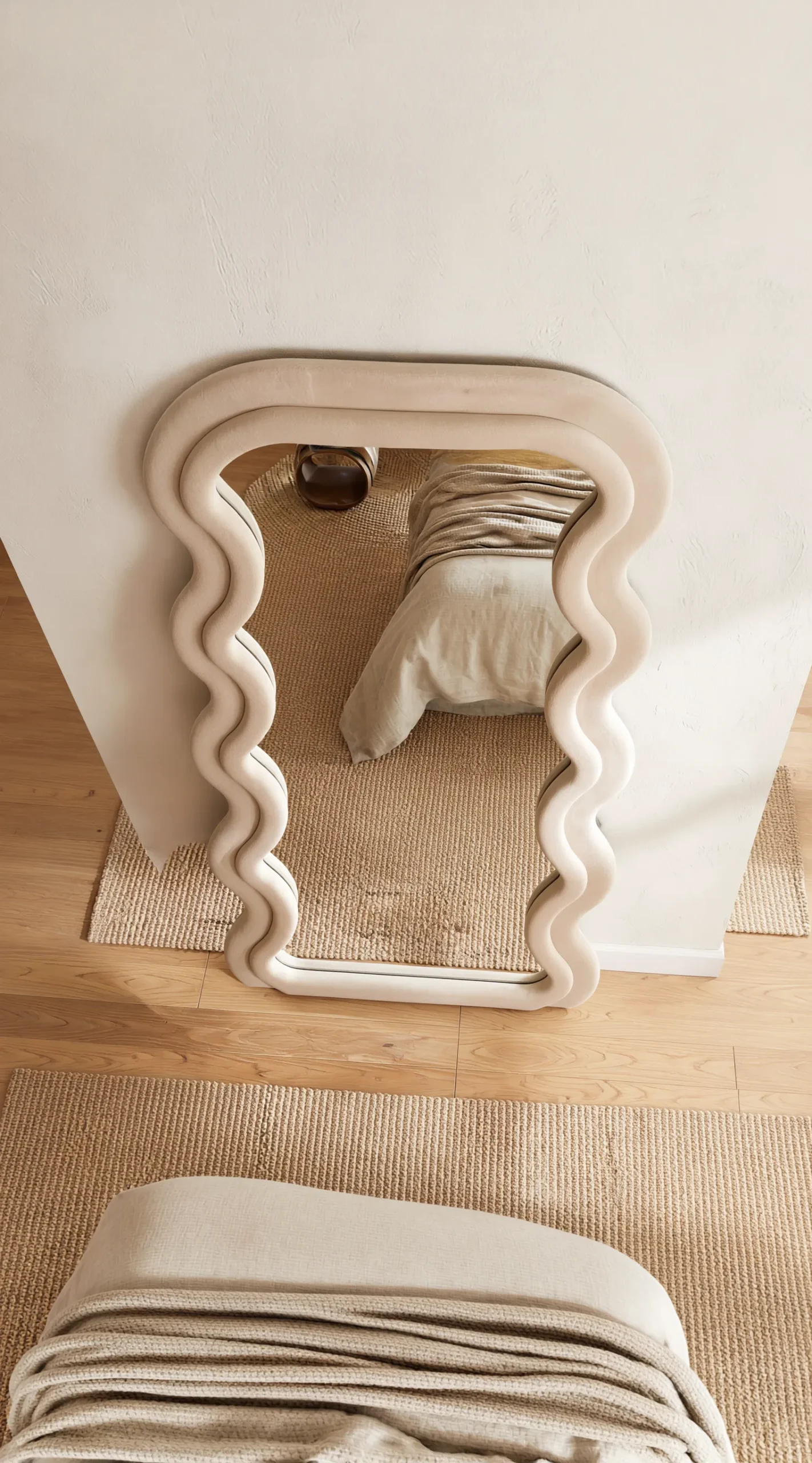 Embrace a softer side of modern design with the Cream Velvet Wave Full-Length Standing Mirror. This piece reimagines the traditional floor mirror by trading hard edges for a plush, velvet-upholstered frame in a timeless cream finish. The signature “wiggle” silhouette introduces an organic, playful energy to your room, making it the ideal centerpiece for a tranquil bedroom, a chic nursery, or a contemporary dressing area.