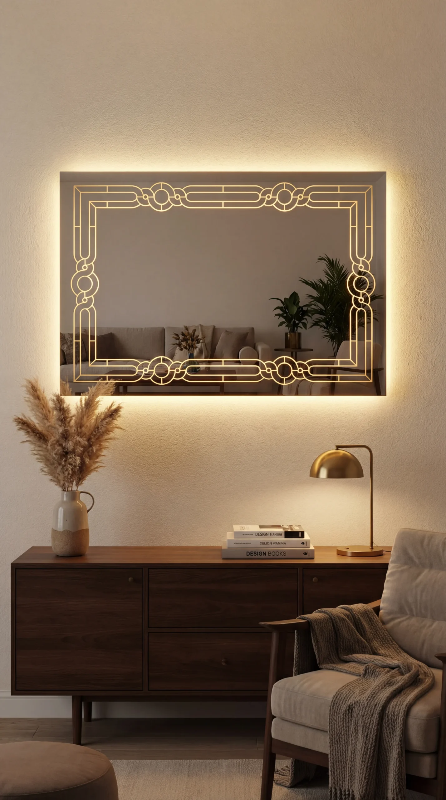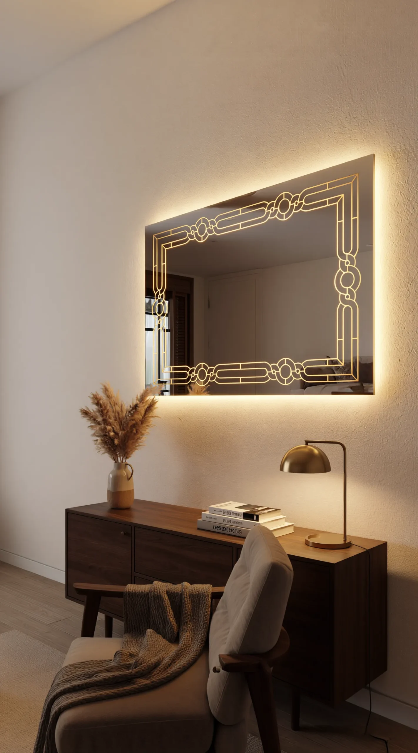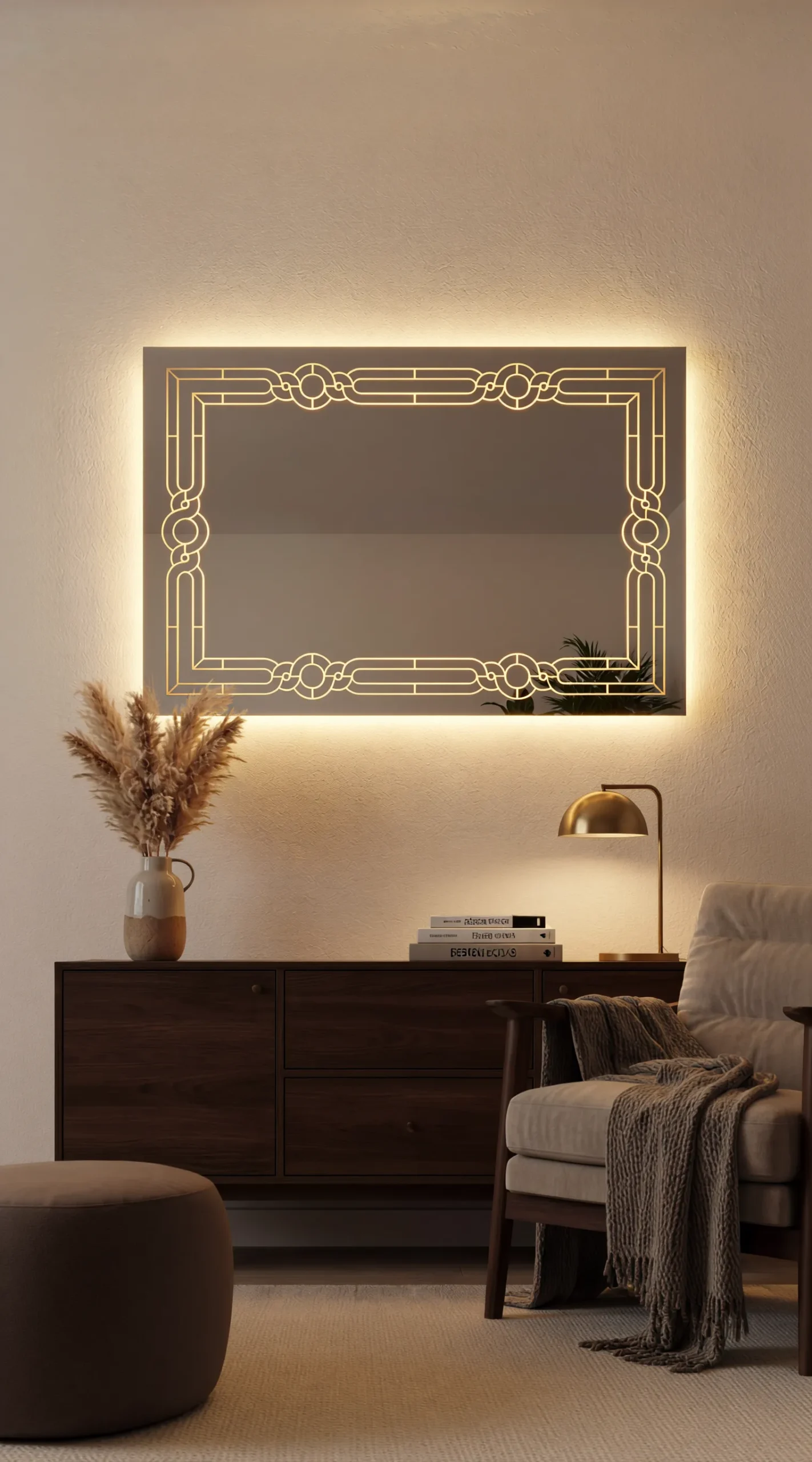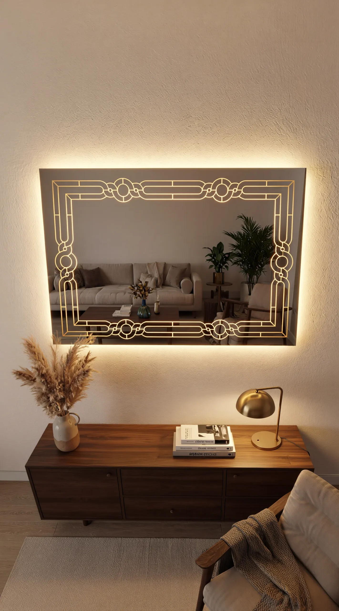 Transport your home to an era of unmatched elegance with the Grand Gatsby Smart LED Mirror. This statement piece from Trendy Livings features a complex, interlocking geometric border that pays homage to the golden age of Art Deco design. The precision-etched pattern is brought to life by powerful internal LED backlighting, casting a warm, sophisticated glow that highlights the architectural beauty of the motif and the surrounding wall.