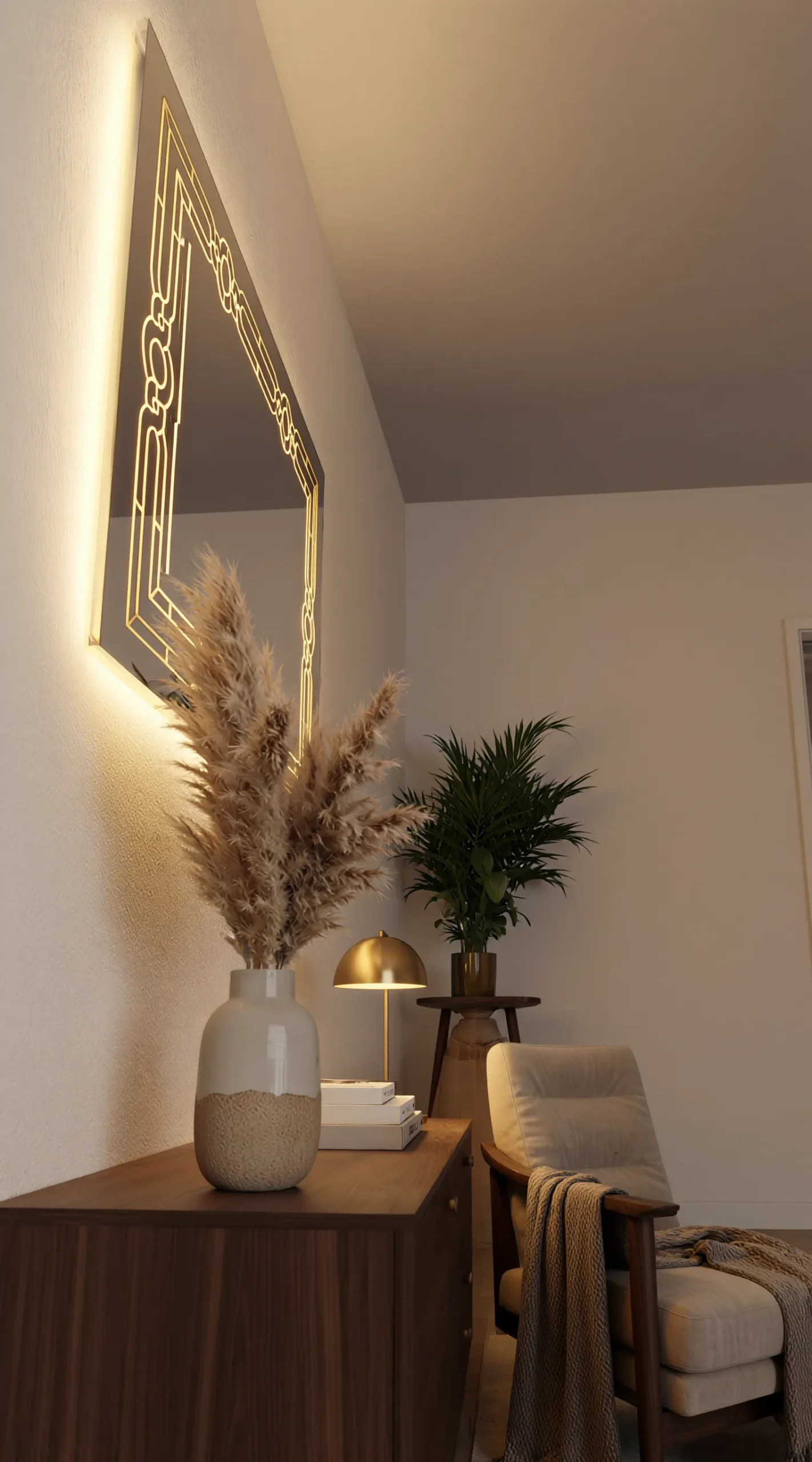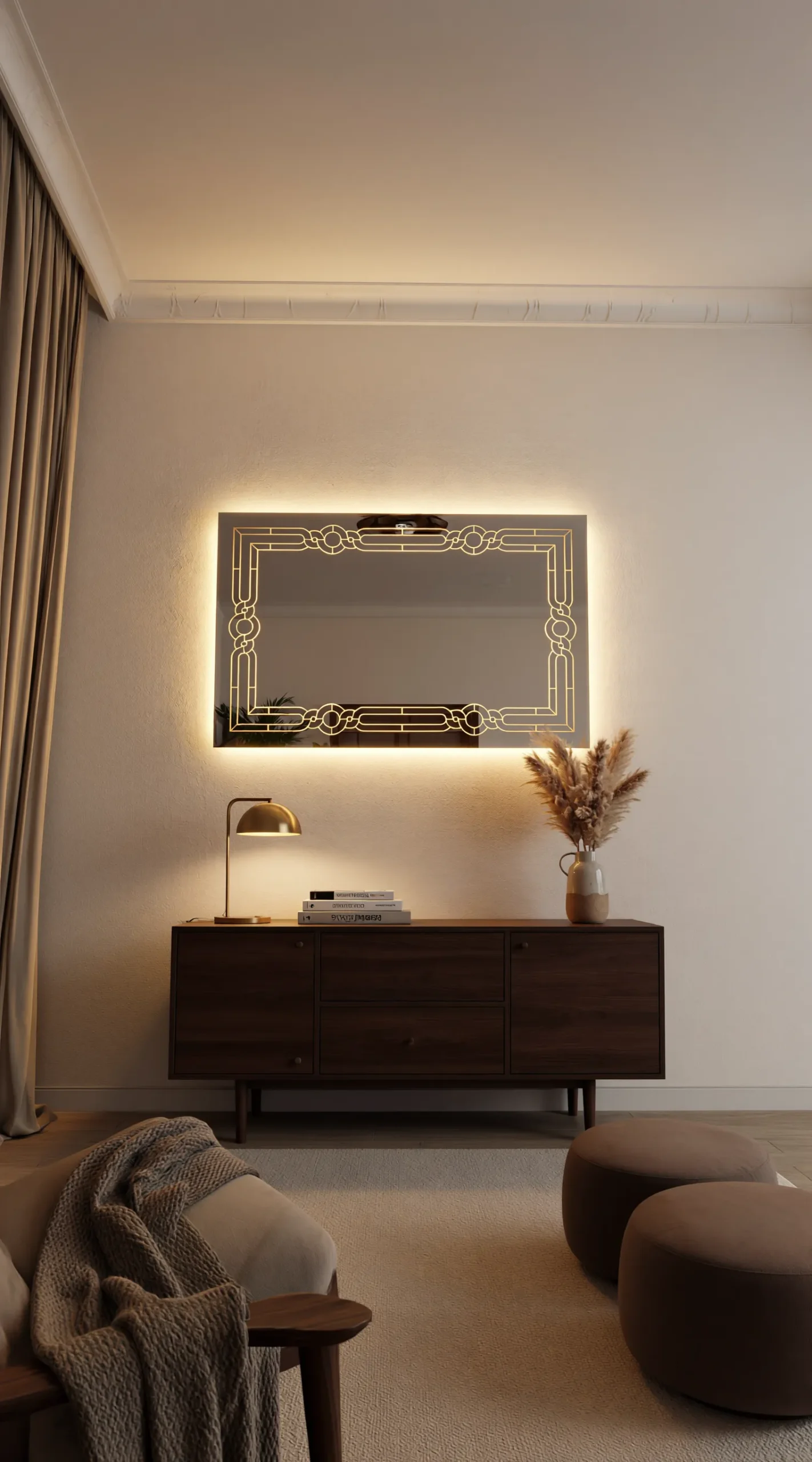 Designed for those who view their home as a masterpiece, the Grand Gatsby serves as both a functional mirror and a dramatic piece of light-up wall art. Its wide horizontal orientation makes it a perfect choice for placement above a mid-century modern sideboard, a master bedroom dresser, or as a luxurious focal point in a formal dining area. The soft halo effect provides beautiful ambient lighting, creating an inviting atmosphere for evening entertaining or a relaxing night in.
