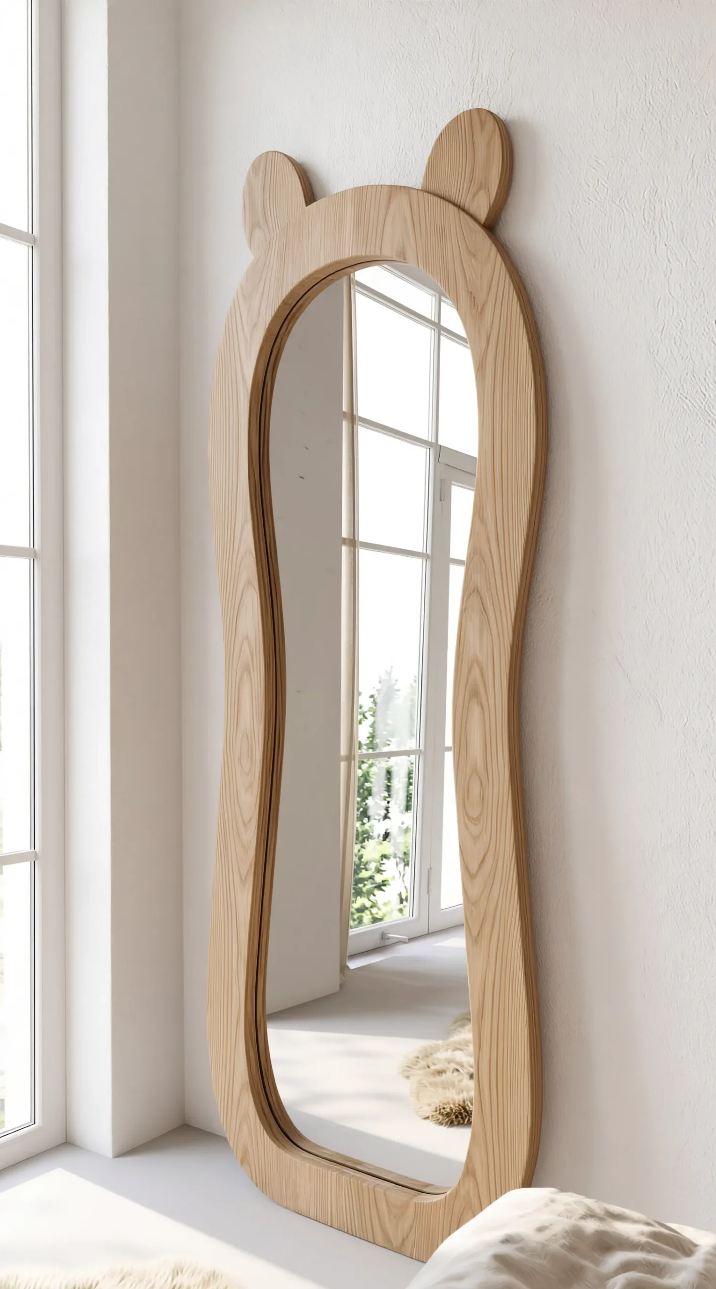 Elevate your home’s personality with our Bear-Ear Full Length Standing Mirror. Merging high-quality craftsmanship with a touch of playful charm, this mirror features a unique organic shape topped with subtle, carved “ears.” The light-toned wood frame brings a warm, Scandinavian feel to your space, making it a standout piece for those who appreciate minimalist design with a creative twist.