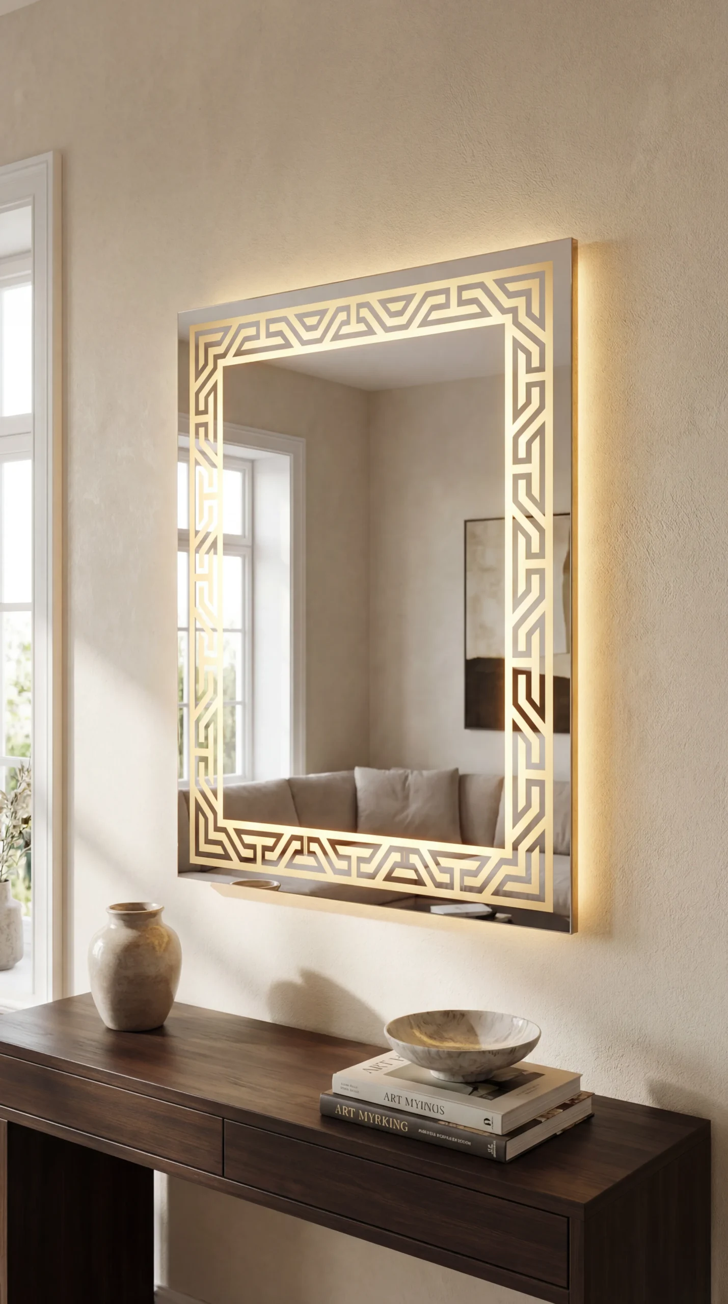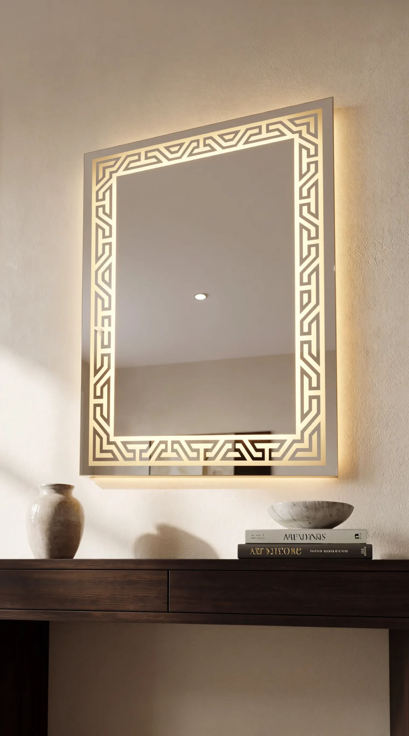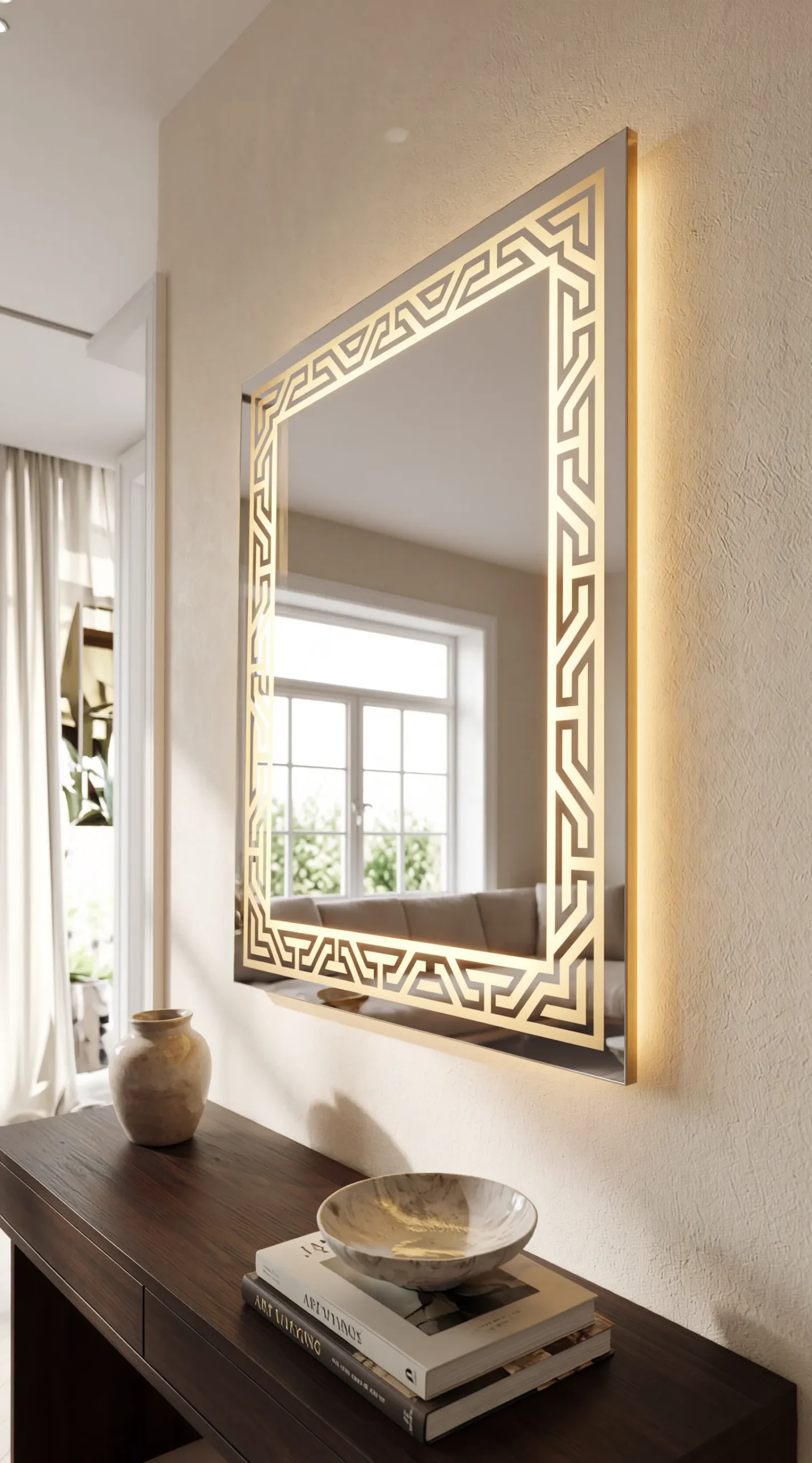 The Olympus mirror is designed to be a centerpiece. Whether placed above a dark wood console table in your entryway or centered over a contemporary bathroom vanity, its geometric border adds a layer of structured elegance to your walls. The warm LED glow is specifically engineered to provide a soft, flattering light that eliminates harsh shadows, making it as practical for grooming as it is beautiful for ambient room lighting.