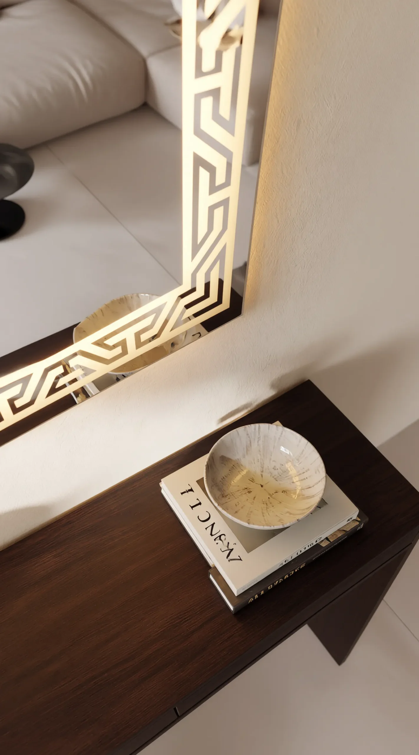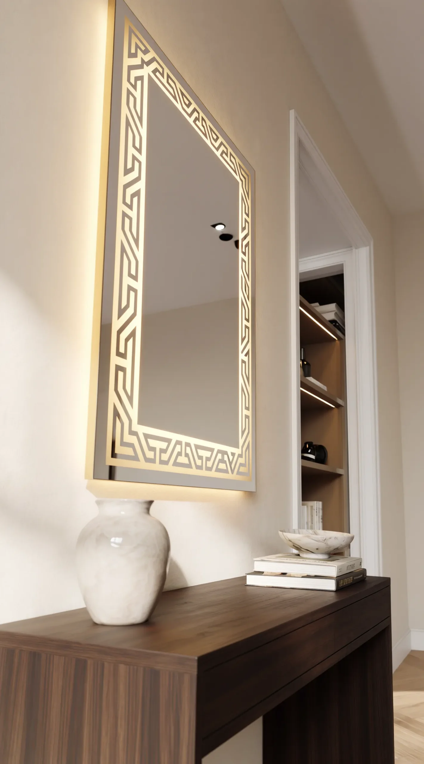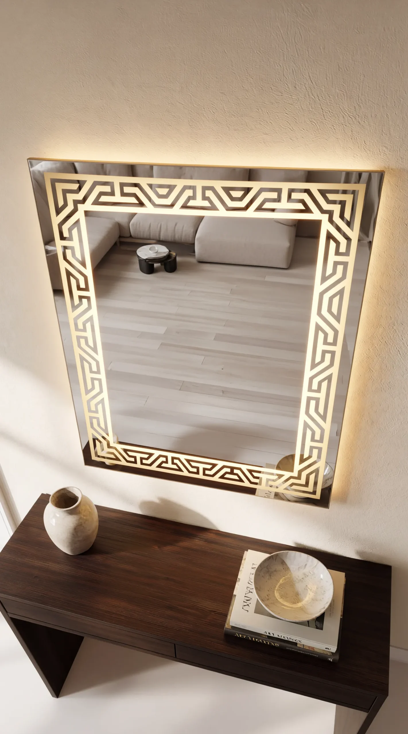 The Olympus mirror is designed to be a centerpiece. Whether placed above a dark wood console table in your entryway or centered over a contemporary bathroom vanity, its geometric border adds a layer of structured elegance to your walls. The warm LED glow is specifically engineered to provide a soft, flattering light that eliminates harsh shadows, making it as practical for grooming as it is beautiful for ambient room lighting.