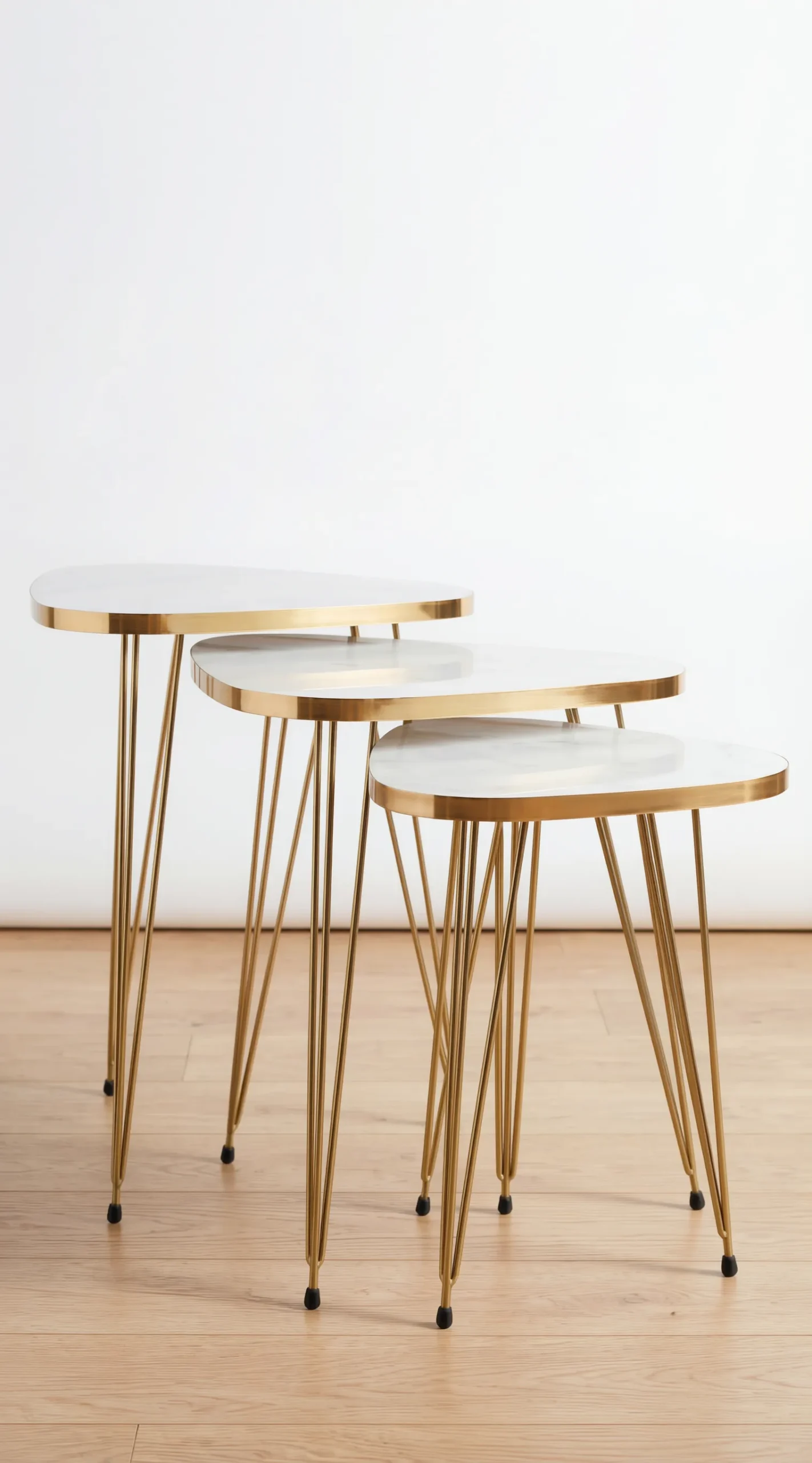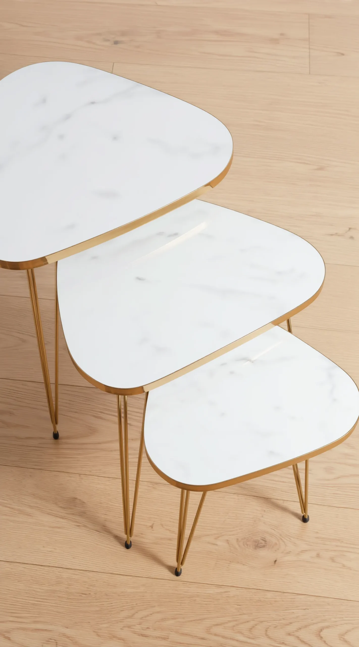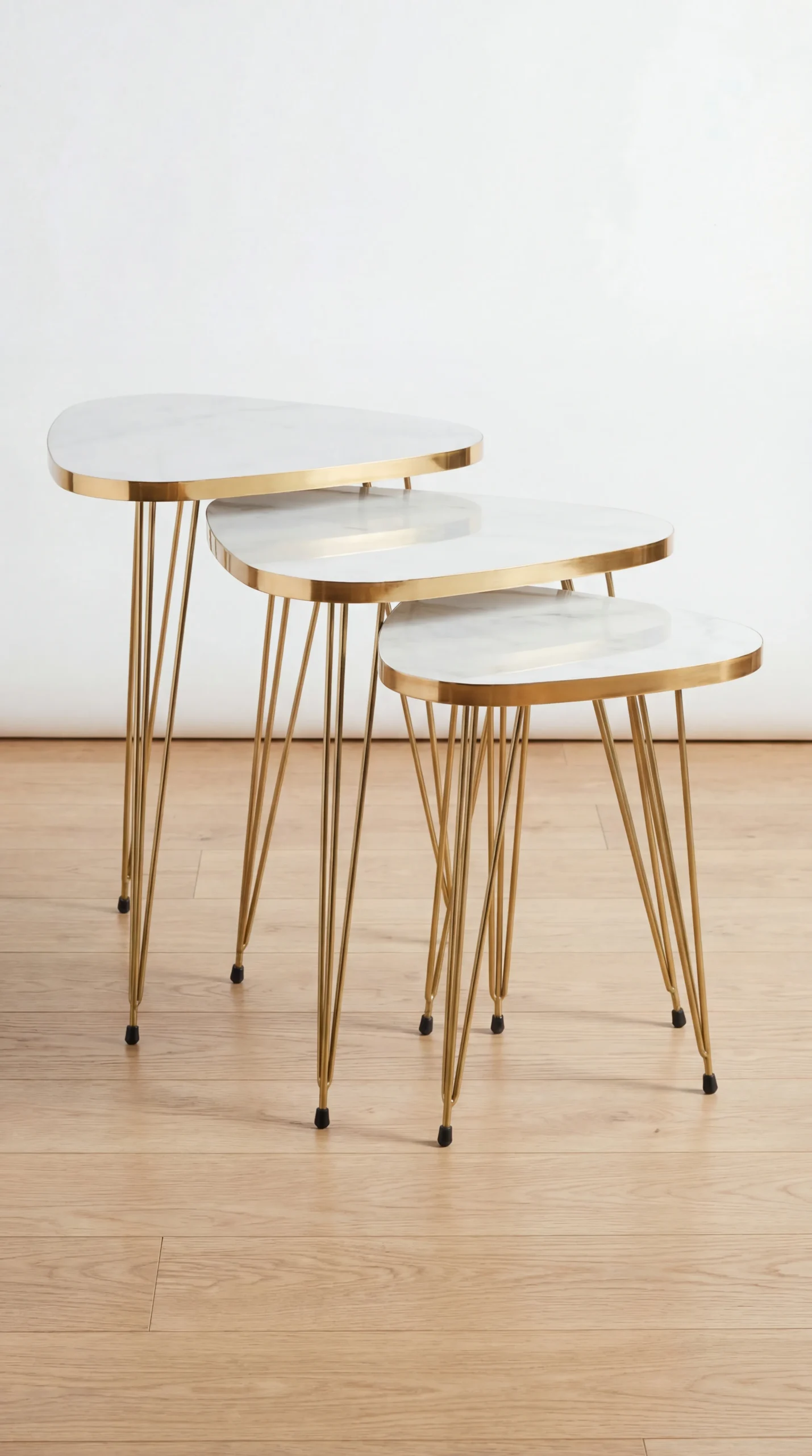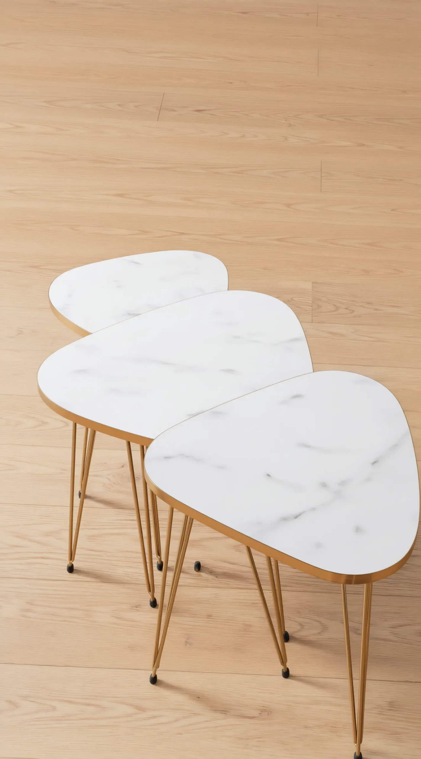 Embrace the beauty of asymmetrical design with the Pebble Marble Nesting Tables. This set of three side tables from Trendy Livings moves away from traditional geometry, utilizing a softened triangular “pebble” shape that feels natural and inviting. The crisp white marble-style tops are accented by a lustrous gold trim, creating a high-contrast look that instantly elevates the aesthetic of any living room or lounge area.